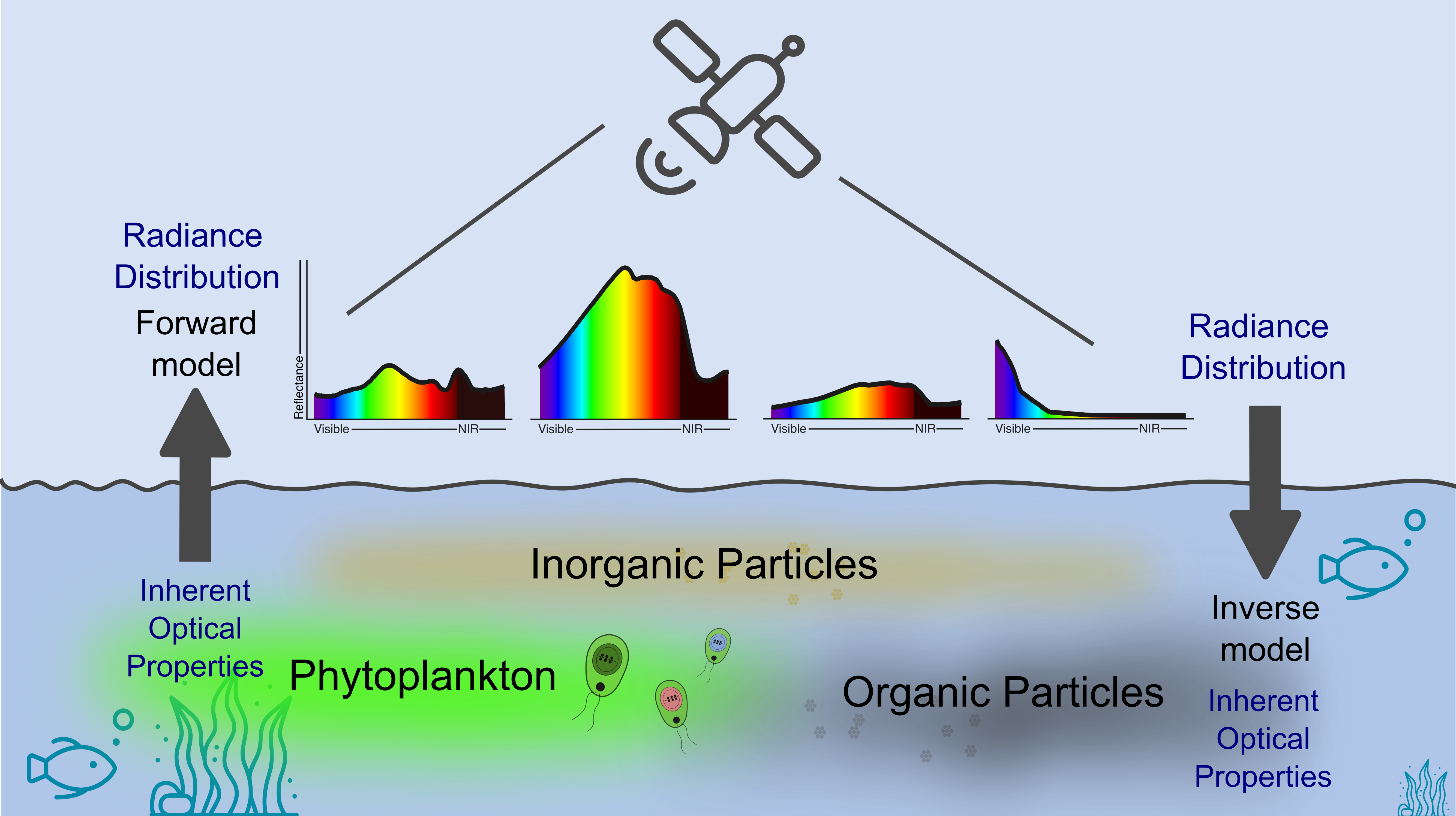 The relationship between water composition and its spectral response forms the foundation of aquatic optics and is commonly described using two complementary approaches: forward models, which simulate radiance from known optical properties, and inverse models, which infer water composition from observed radiance signals.